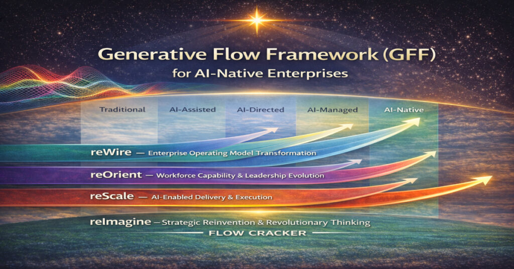 Flow Cracker’s Generative FLow Framework (GFF) helps your Enterprise to reWire the enterprise for AI-Native value flow, reOrient the workforce with AI-Native capabilities, and reScale delivery using AI-DLC.