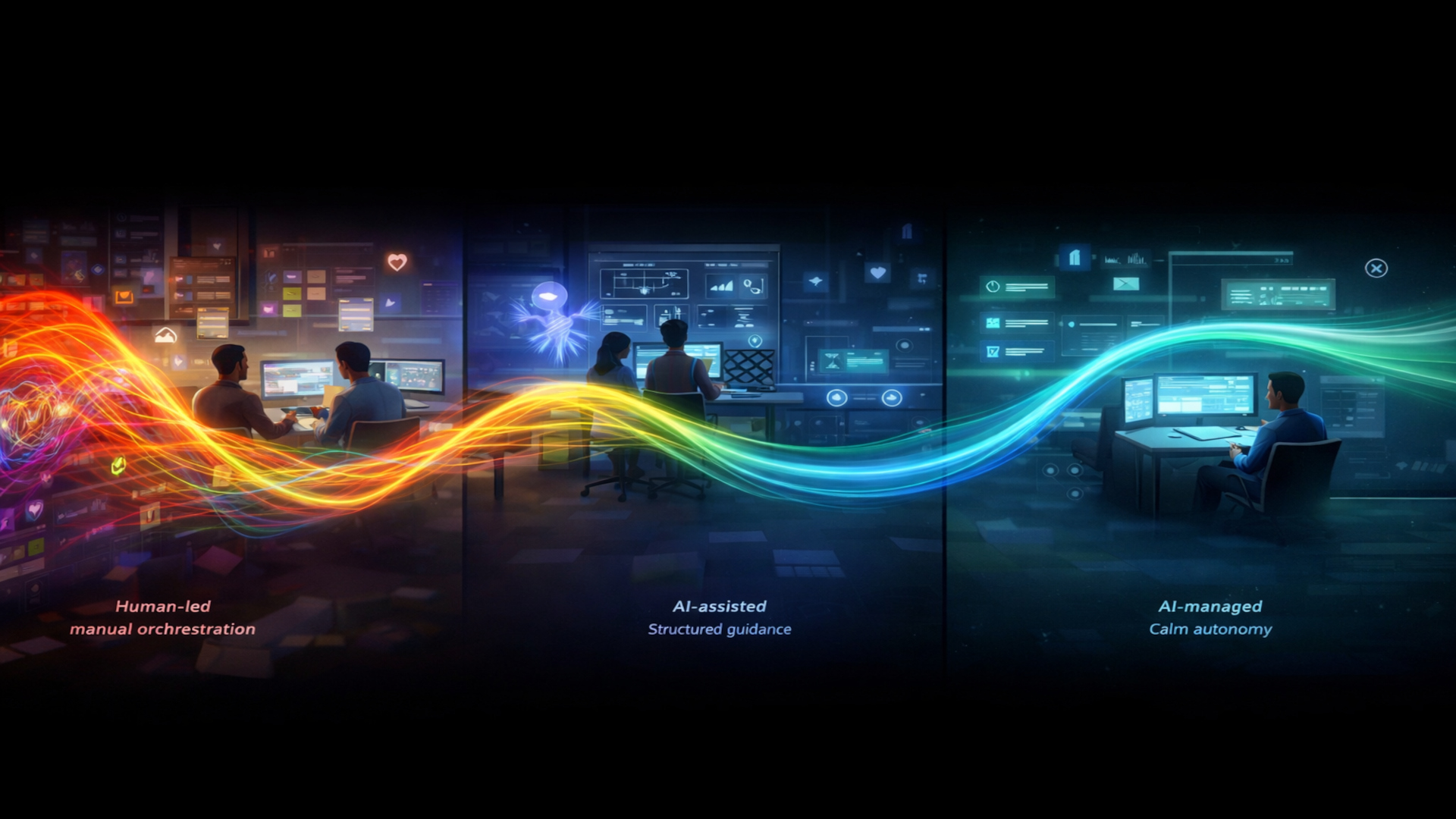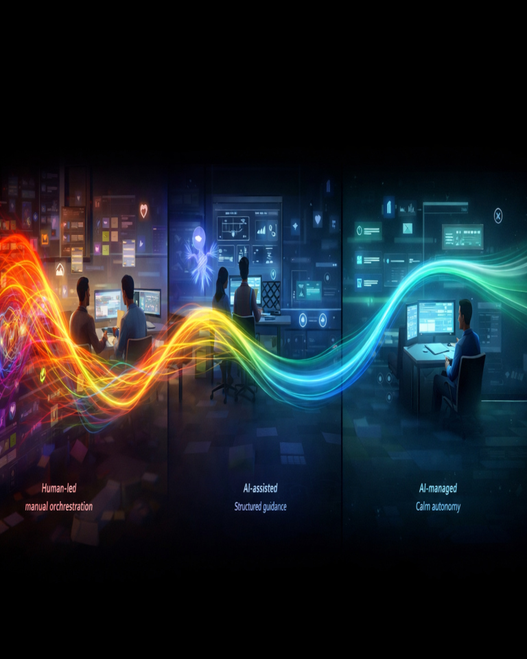 AI-ManagedAI orchestrates larger parts of delivery — coordination, readiness packaging, verification signals — with human oversight and boundaries.